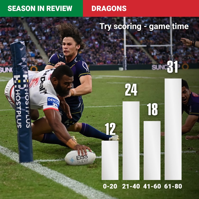 The Dragons found tries comparatively hard to come by in the first 20 minutes of each half throughout 2021, but ranked inside the top eight for tries scored in the second half of each half.