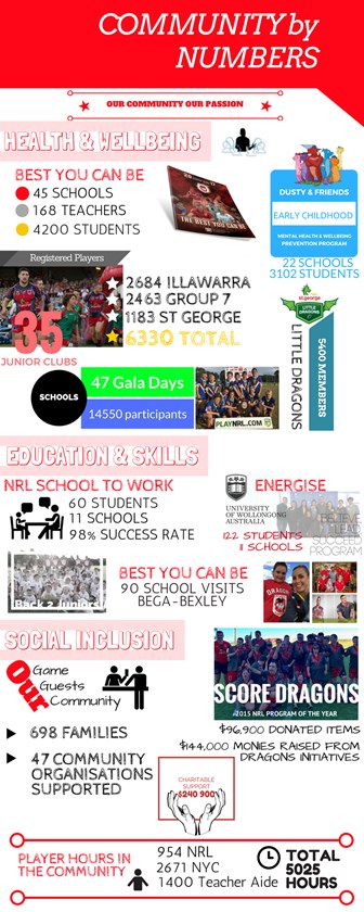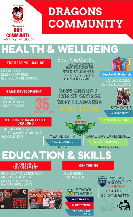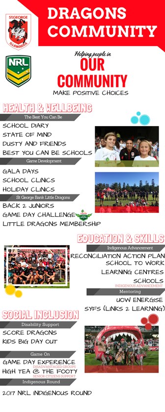 Dragons Community is driven by its role as a representative of the Red V community and committed to playing a positive role across the St George, Illawarra and South Coast regions.