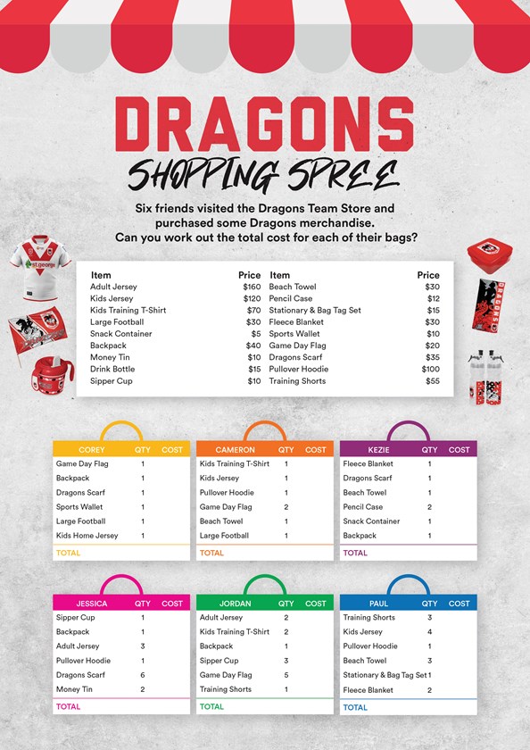 Six friends visited to the Dragons Team Store online, can you work out how much they spent? Ask an adult to double check your answers.