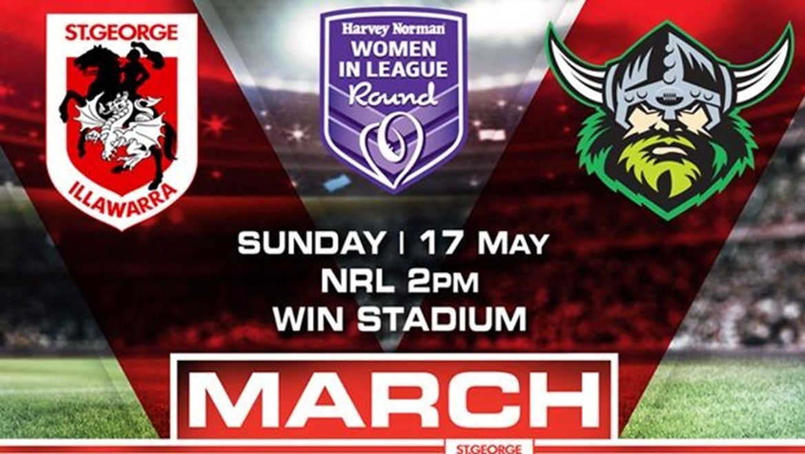 The St George Illawarra Dragons will host the Canberra Raiders in the "Women In League Round" fixture at WIN Stadium, Wollongong on Sunday!