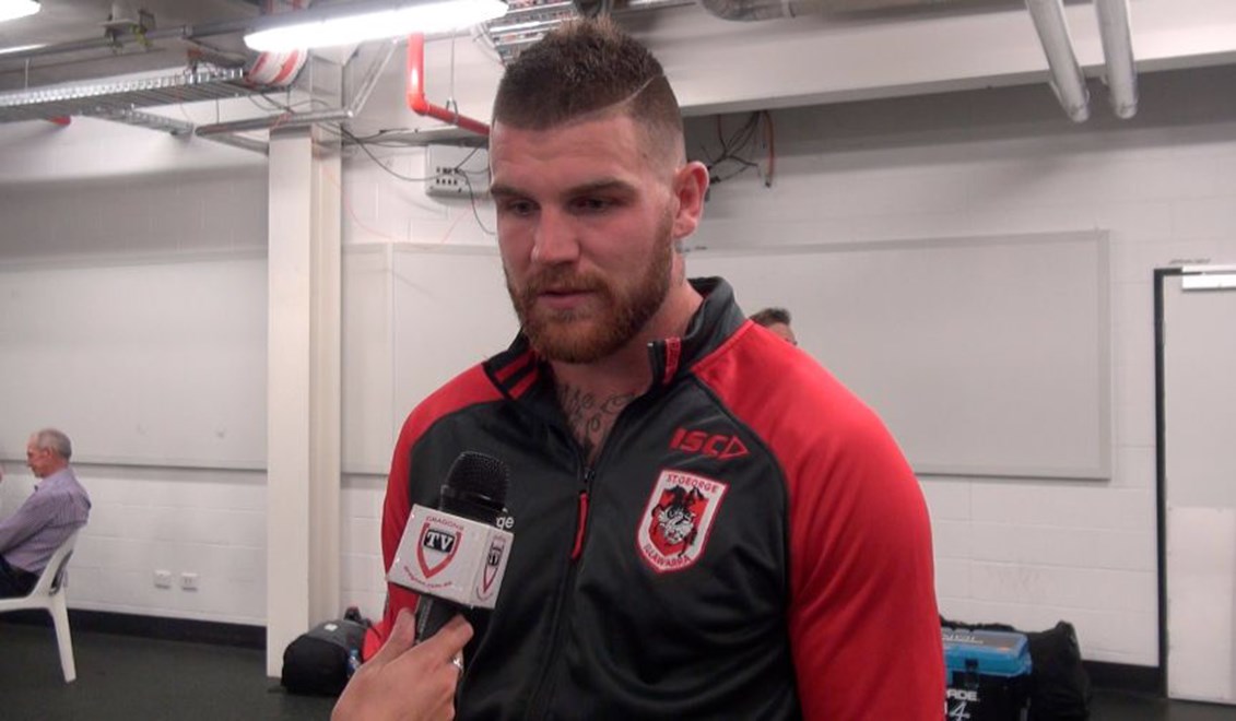 St George Illawarra Dragons fullback Josh Dugan gives his reaction in the sheds following the 26-0 defeat by the Brisbane Broncos at Suncorp Stadium, Brisbane on Thursday.