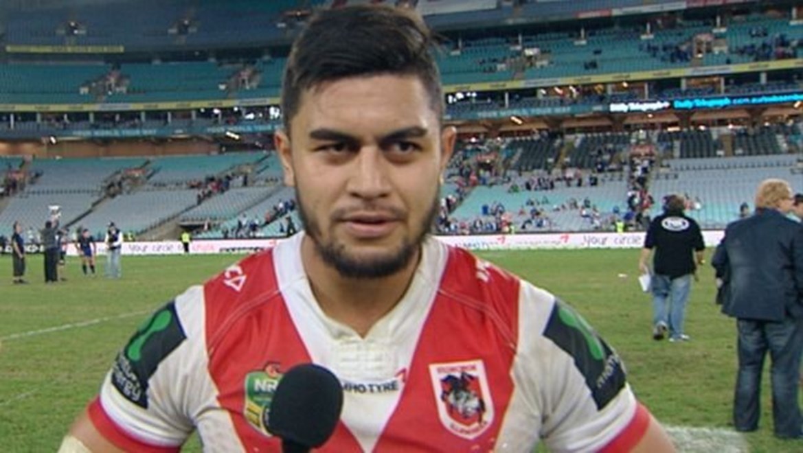 St George Illawarra Dragons centre Tim Lafai gives his reaction following the 34-16 loss to his former club the Canterbury-Bankstown Bulldogs at ANZ Stadium, Olympic Park on Monday.