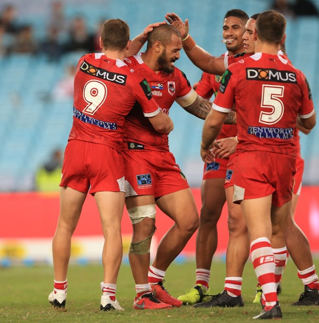 St George Illawarra prop Leeson Ah Mau - in his 100th NRL game for the club - reacts to the Dragons' 28-6 win over the Wests Tigers at ANZ Stadium, Olympic Park on Sunday afternoon.