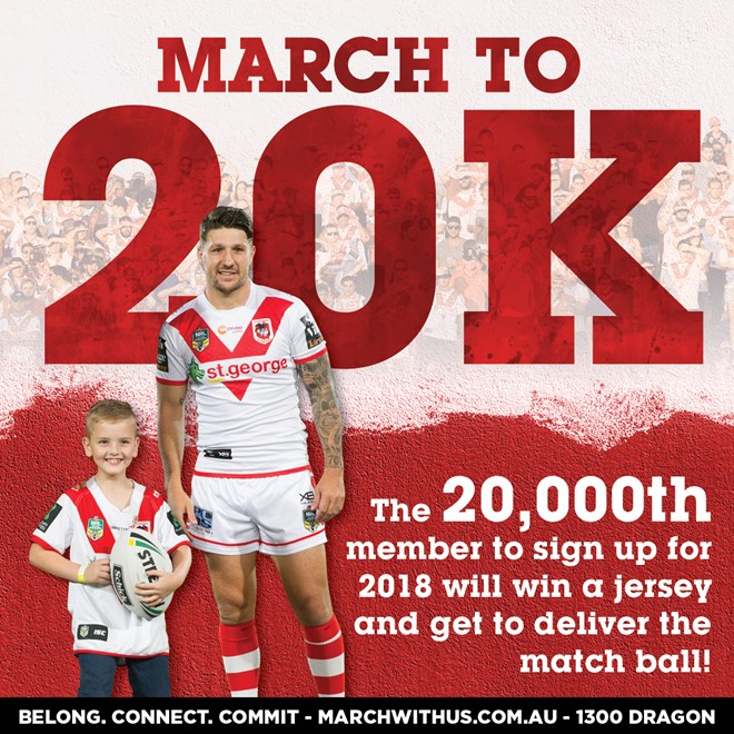 The 20,000th member to sign up this season will be granted the privilege of delivering the match ball onto the field at our next home game and be presented with a brand new 2018 Dragons jersey.