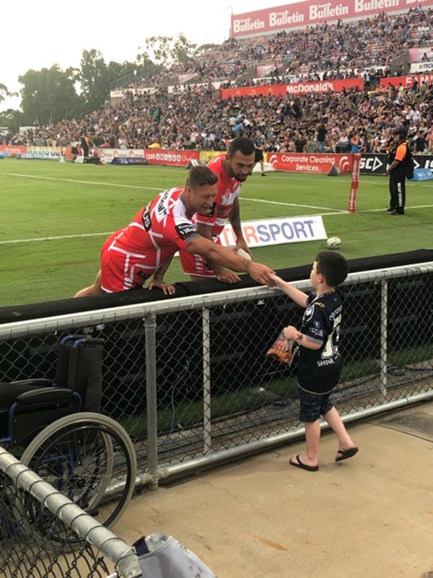 "My son and I attended the Cowboys vs Dragons game last weekend. We took our seats about half an hour before the two teams came out to warm up. My son Ashton became quite upset over missing out on a high-five with [Cowboys mascot] Bluey and started to cry into my shoulder. The Dragons ran out to our end of the field and I noticed Tariq Sims look in our direction and pointed towards my son as he said something to Josh Kerr. Both players then came over and asked what was wrong and wanted to cheer him up. Tariq even asked if he could steal a snake lolly! Even though he was in a Cowboys jersey and they were both about to warm up for the season opener, this made my boy's night, and it goes to show just how much good league players can do when they're not getting dragged through the mud with allegations. Thank you Tariq and thank you Josh, you gave my son and I a moment to treasure for a lifetime!"