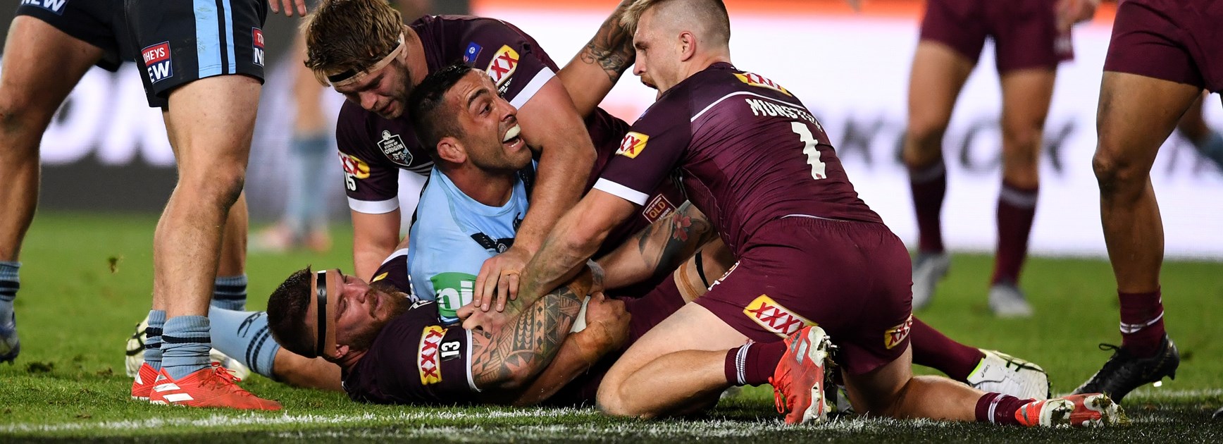 The Maroons were knocked again soon after when the brute strength and sheer speed of James Tedesco saw him carry two Queensland defenders over the line to give the Blues somewhat of an underserved lead.