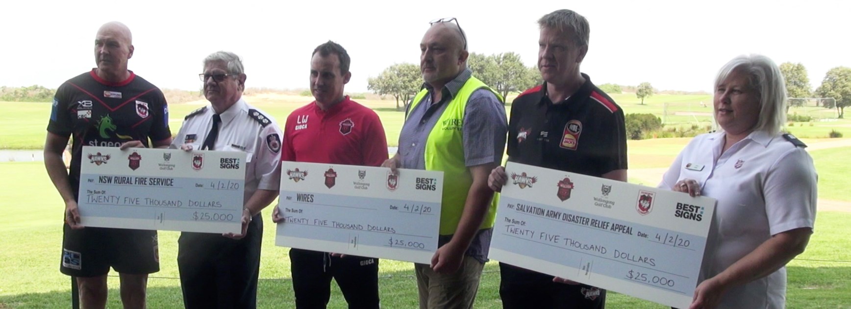 The $75,000 was distributed evenly and presented to representatives of the Australian Wildlife Rescue (WIRES), the Salvation Army Disaster Relief Appeal and the NSW Rural Fire Service, at Wollongong Golf Club on Tuesday afternoon.