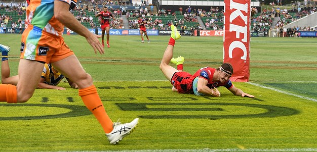The Dragons and the Panthers face off in the second quarter final of the 2020 NRL Nines tournament in Perth