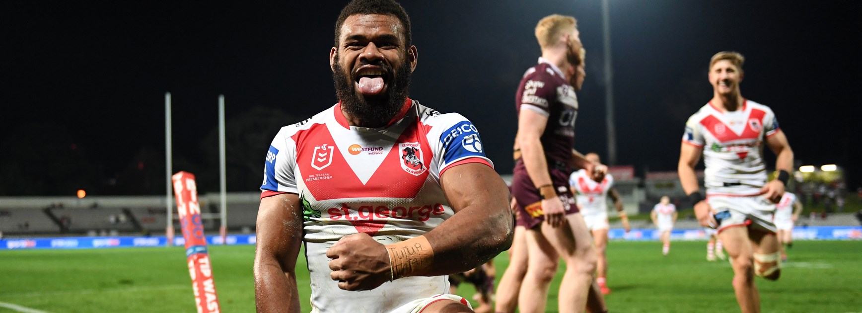 The Fijian pulled off several driving tackles that brought the Netstrata Jubilee Oval crowd to life in a 34-4 win, overshadowing his Sea Eagles counterpart nicknamed the Grim Reaper.