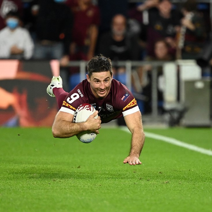 The Maroons thought they had crossed for just their second try of the series when Valentine Holmes hammered rookie Blues No.7 Mitch Moses and gathered the spilt ball to dive under the posts, only to be disallowed for knocking on in the process.