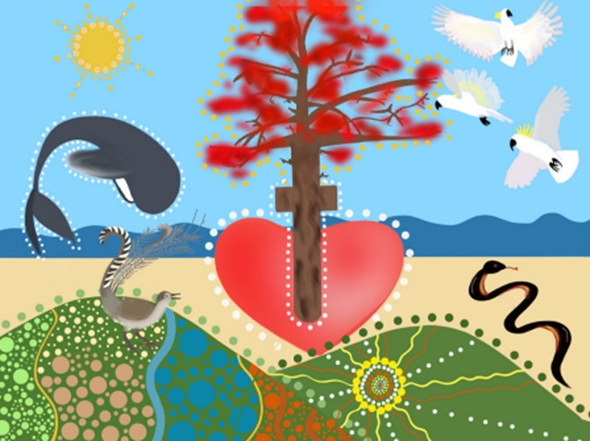 I have incorporated into this artwork the Illawarra flame tree, which is connected to a cross and heart. The cross and heart represent my school logo and motto "Moved to Compassion" because we must always care for our environment and planet and strive to make it a better place for future generations to live in.