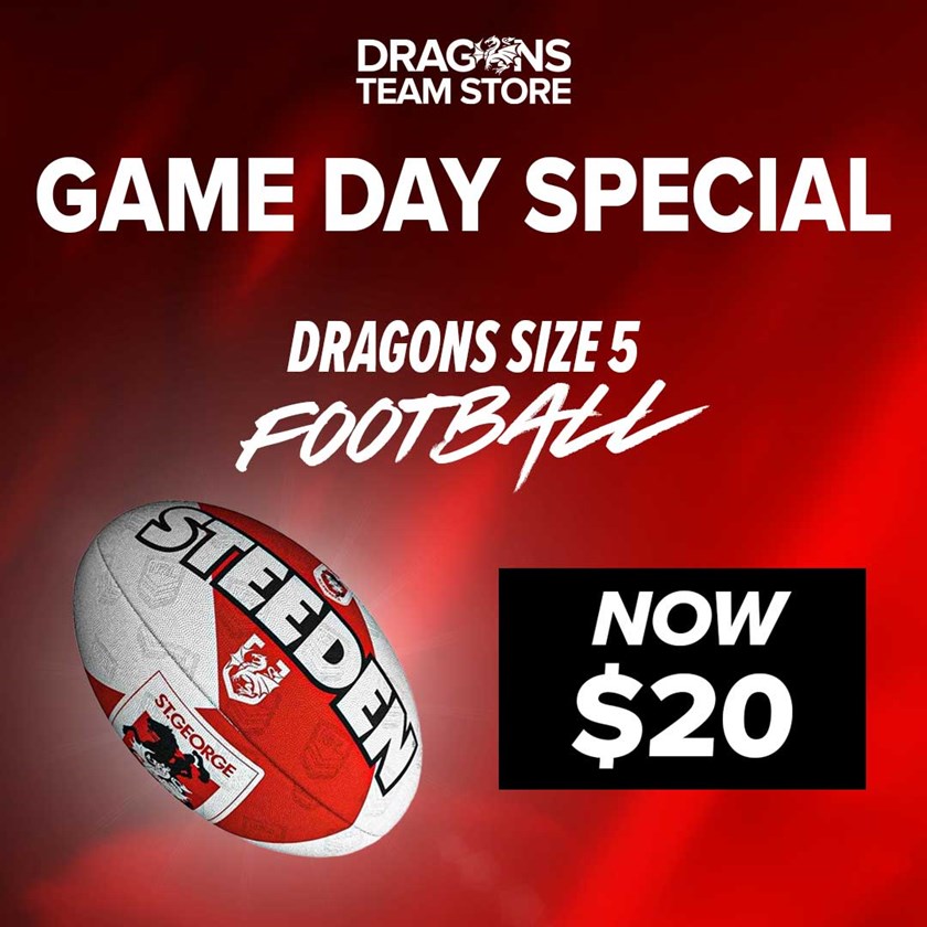 Head to the game, then head straight to your local footy field to kick around your new Dragons football! Available for just $20 this game day.