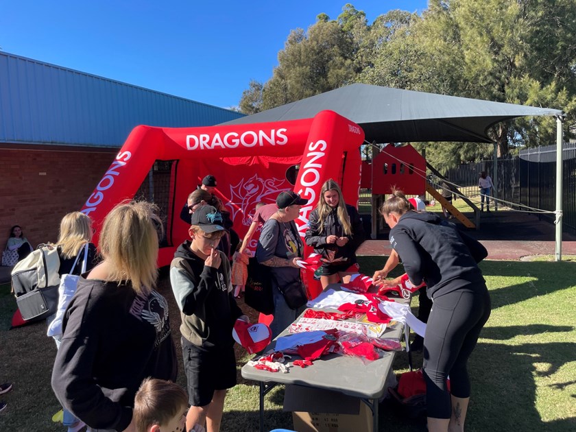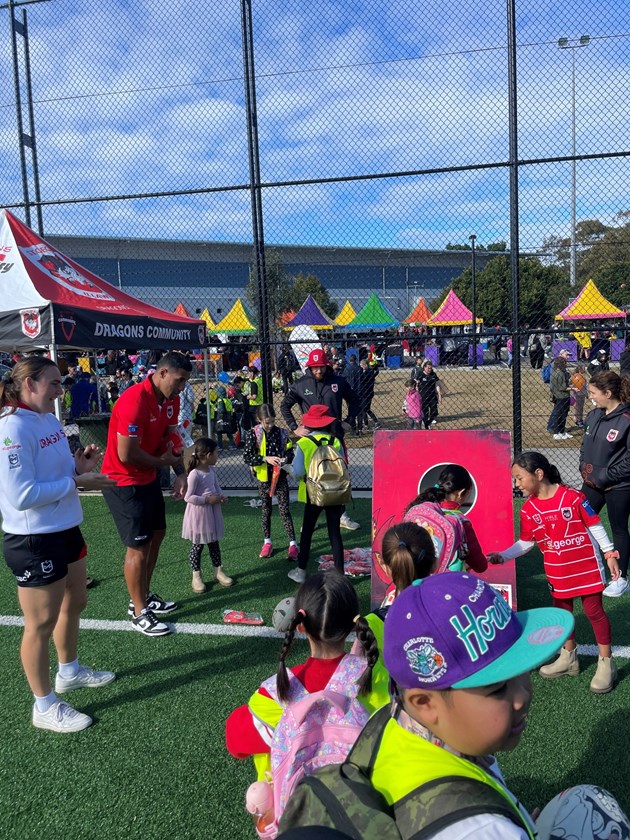 Indigenous All Stars representatives Tyrell Sloan – a Koonawarra local and proud Wiradjuri man – and Bobbi Law – a proud Worimi woman – were in attendance at the NAIDOC Family Fun Day at Koonawarra Community Centre along with Dragons CEO Ryan Webb and his family as well as NRLW recruit Tyla Nathan-Wong.