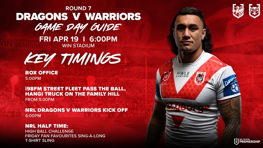 The Dragons will meet the Warriors on Friday, April 19th at WIN Stadium, Wollongong in Round 7 of the 2024 Telstra Premiership.