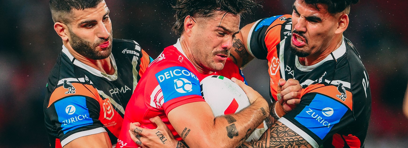 The Dragons again went painfully close to another only for Holmes’ final pass to go to ground as the Wests Tigers stole possession away courtesy of a successful Captain’s Challenge.