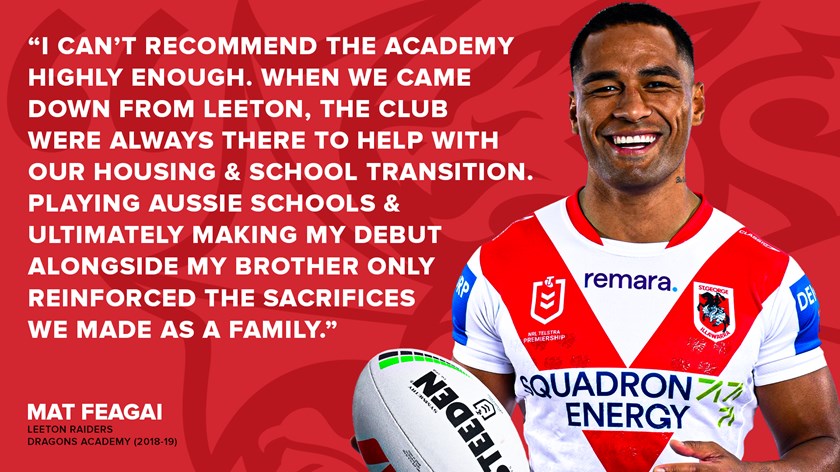 A talented outside back hailing from the Riverina region of NSW, Mathew Feagai relocated to Wollongong as a 16-year-old alongside twin brother Max to link up with The Dragons Academy.